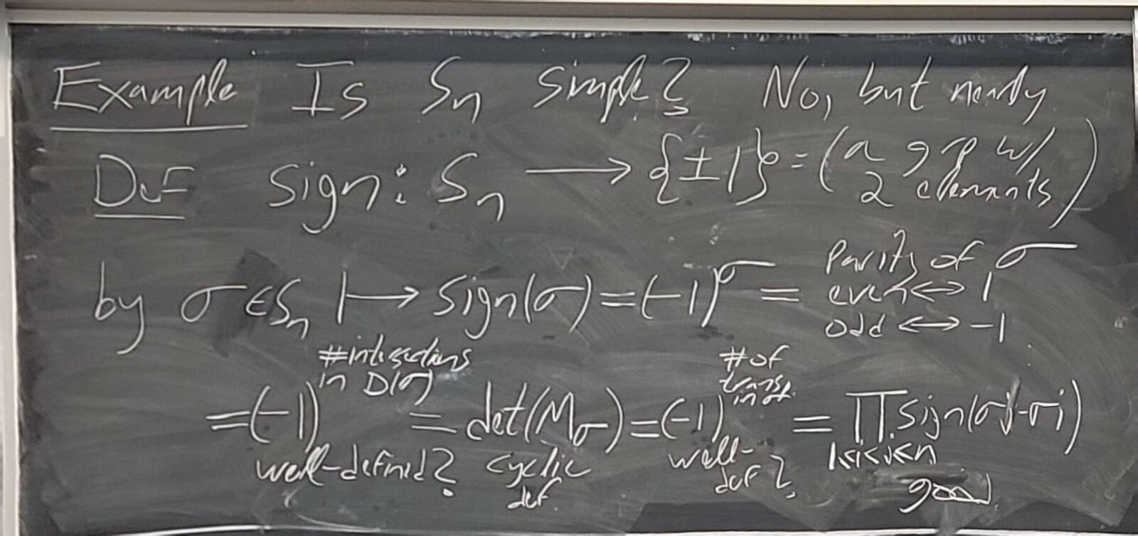 251001-123330: Oct 1 Hours 13-14: Simple groups, signs of permutations, the simplicity of $A_n$ (7).